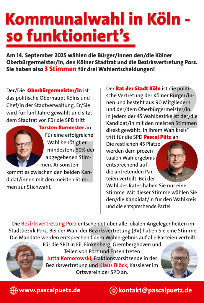 So funktioniert die Kommunalwahl in Köln: Am 14. September 2025 wählen Sie Oberbürgermeister/in, Stadtrat und Bezirksvertretung Porz. Drei Stimmen – drei Entscheidungen. Hier kompakt erklärt.