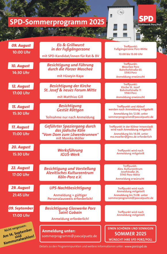 Wir werden natürlich wieder als Mandatsträger aus dem SPD-Ortsverein Porz-Eil, Finkenberg, Gremberghoven über die politische Arbeit im Kölner Stadtrat und in der Porzer Bezirksvertretung informieren und geben Auskunft über aktuelle Themen in Porz und seinen Stadtteilen.
