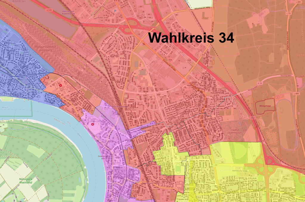 Seit der Kommunalwahl am 13. September 2020 darf ich als direkt gewähltes Mitglied den Wahlkreis 34 im Kölner Stadtrat vertreten. Der Wahlkreis 34 umfasst Gebiete aus den Stadtteilen Porz-Eil, Finkenberg, Gremberghoven, Physikersiedlung (Porz II) und Ensen. Im Wesentlichen deckt sich der Wahlkreis mit dem Gebiet und Stadtteilen meines SPD Ortsverein, in welchen ich mich schon vor meiner Wahl in den Rat engagierte.