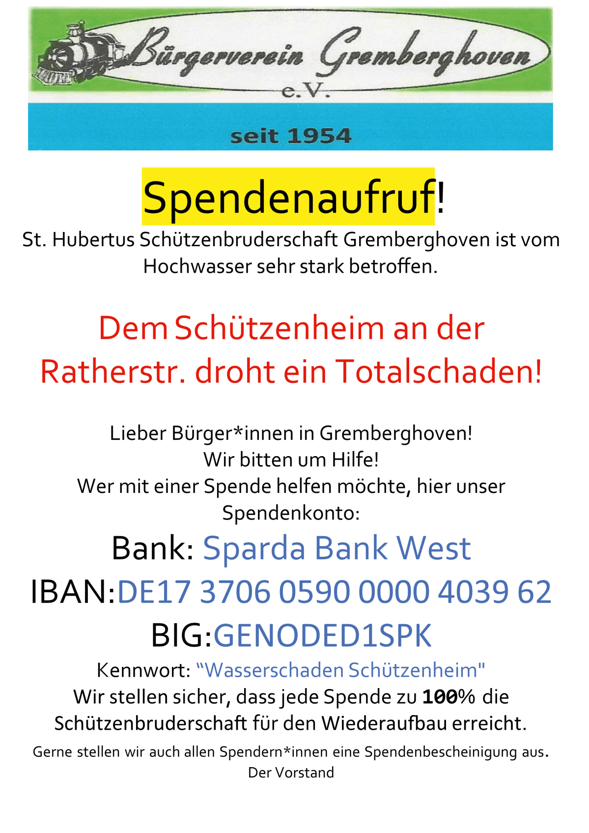 „Die St. Hubertus Schützenbruderschaft gehört zu Gremberghoven. Ohne das jährliche stattfinden Schützenfest wollen wir uns Gremberghoven nicht vorstellen“, fasst Vorsitzender Gunther Geisler den Hintergrund der Spendenaktion zusammen. „Wir möchten so einen Beitrag für den Wiederaufbau beitragen und versprechen dass jeder Euro die St. Hubertus Schützenbruderschaft auch erreicht.“