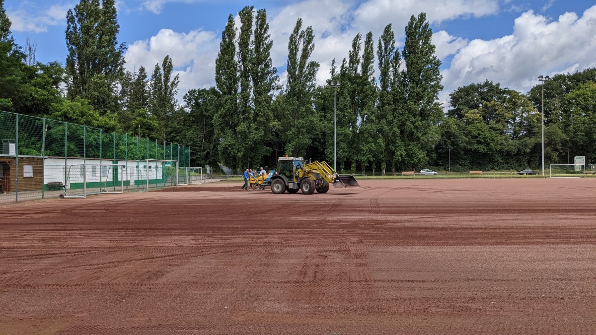 Sehr schön! Mitarbeiter des Sportamts können unkompliziert dem Sportverein ESV Gremberghoven helfen und verteilen neue Asche auf dem Platz. Dies ist nach dem Starkregen vor 14 Tagen auch notwendig, weil einige Tonnen Asche weggespült wurden. Dies gefährdete den Spielbetrieb und den weiteren Aufbau der Jugendabteilung. Danke!