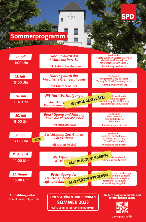 für die Sommertage 2023 bietet die SPD Porz/Poll für Sie ein Sommerprogramm an und freut uns über ihre Anmeldung.