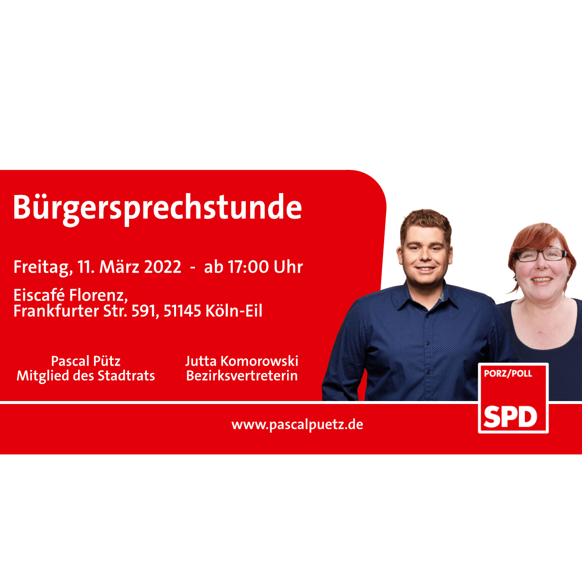Am Freitag, 11.03.2022 laden Bezirksvertreterin Jutta Komorowski und ich zur Bürgersprechstunde der SPD ab 17:00 Uhr in das Eiscafé Florenz, Frankfurter Str. 591 in Porz-Eil ein.